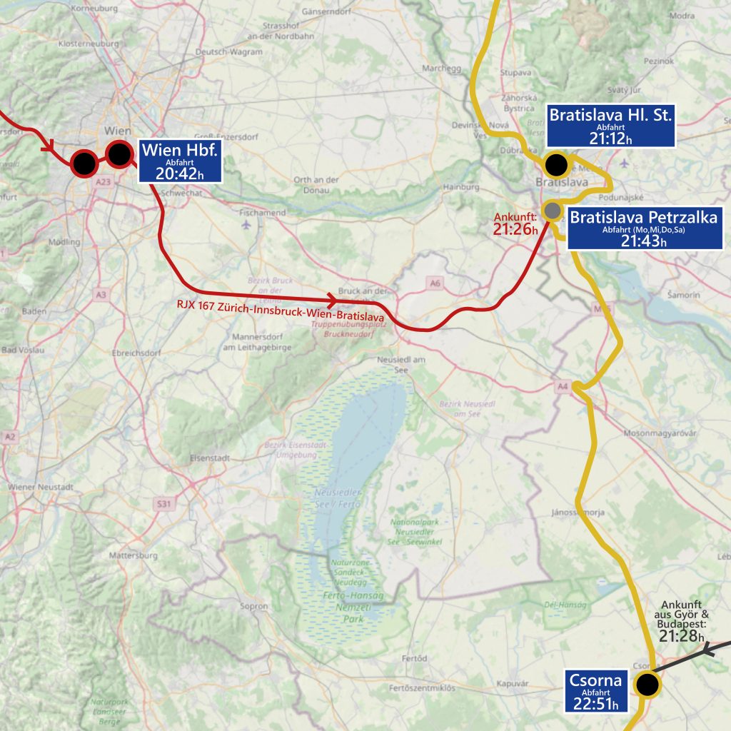 Quelle: Eigene AufnahmeAn 4/7 Tagen hält der Zug auch im südlicheren Bahnhof Bratislavas, in Petrzalka. Dort ergibt sich eine knappe aber sehr gute Umstiegszeit von nur 17 Minuten vom aus Zürich ankommenden RJX 167 und kann damit auch für Menschen aus Nieder-, Ober- und Westösterreich interessant sein.